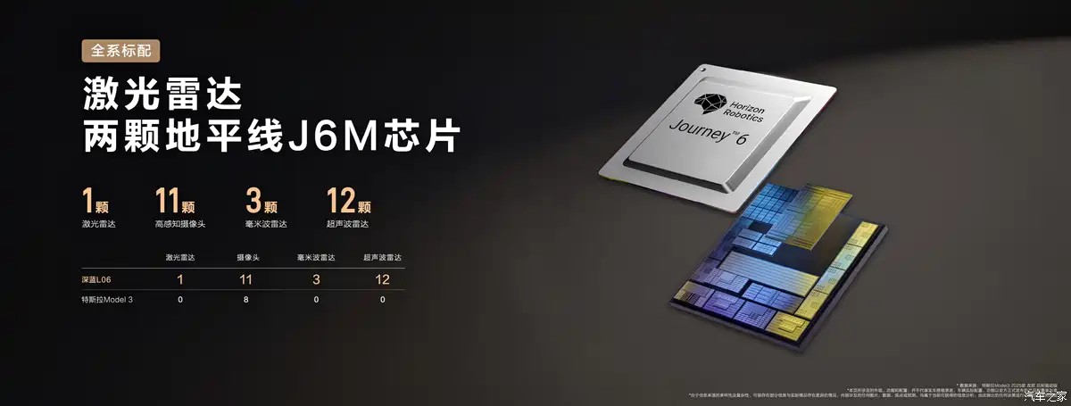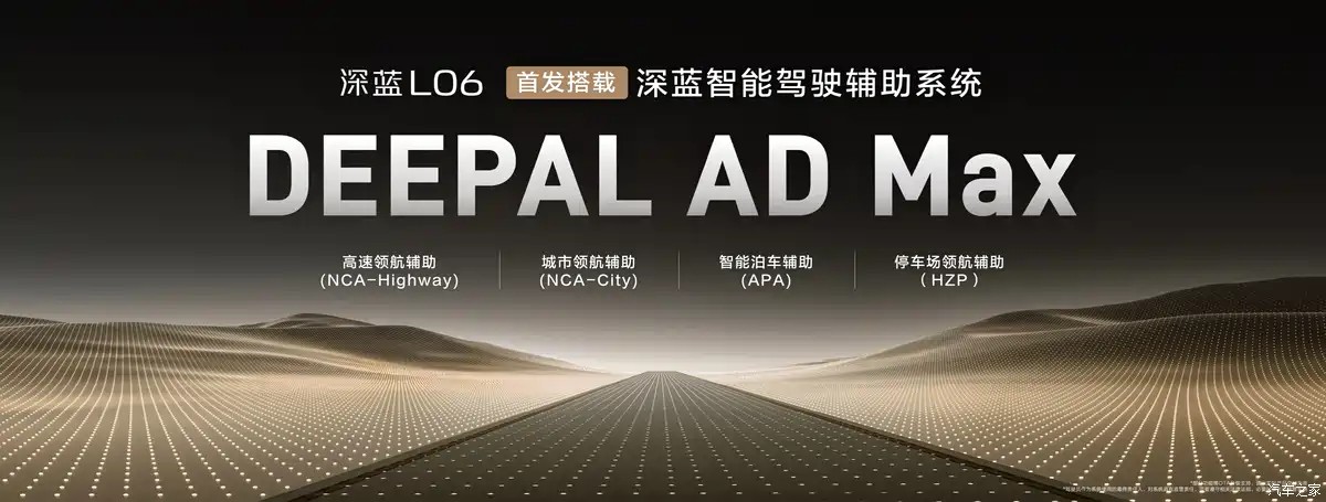 辅助驾驶方面,深蓝L06提供1颗激光雷达+毫米波雷达*3+前视摄像头*2+侧视摄像头*4+环视摄像头*4+后视摄像头*1+超声波雷达*12,共27颗传感器。新车搭载最新一代激光雷达(禾赛小巧型高性能激光雷达ATX)。同时,车辆还搭载两颗地平线J6M芯片,提供256TOPS算力,配备DEEPAL AD Max智能驾驶辅助系统,提供高速/城市领航辅助驾驶、智能泊车辅助 、遥控泊车、记忆泊车等90项驾驶辅助功能。此外,车辆还支持漫游辅助驾驶系统CPA功能,导航未设置或结束/关闭情况下,系统自动进入漫游辅助驾驶状态,并基于用户指令或默认策略进行安全向前巡航行驶。同时,车辆也将提供停车场漫游CPA功能。