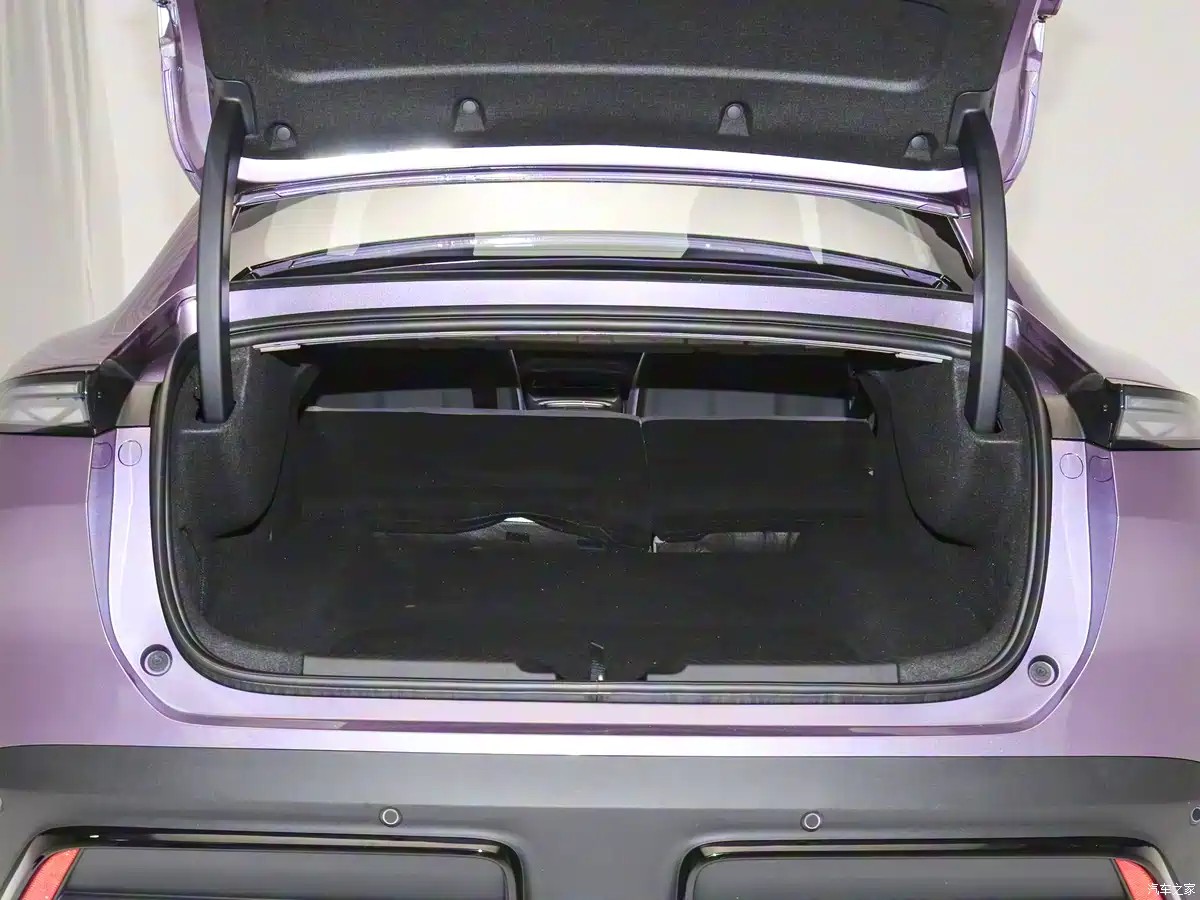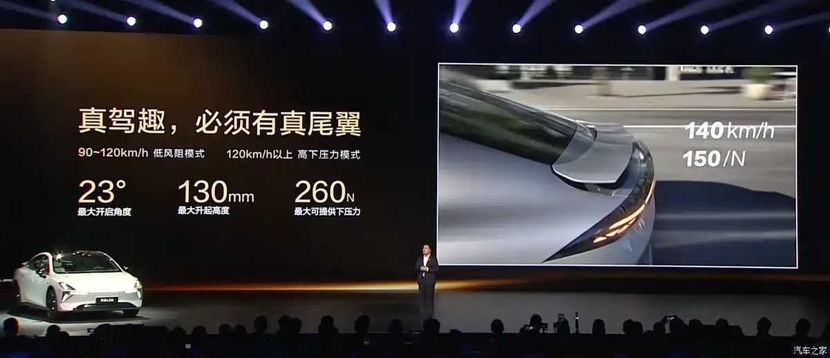 车辆尾部配备了随速电动后扰流板,最大开启角度23°、升起高度130mm,兼具视觉与性能。时速超过90km/h,自动升起;超过120km/h,进入高下压力模式,最大提供260N下压力(相当于26kg配重)。同时,车尾后扰流板可手动自定义无级(10挡)调整尾翼开合角度大小,后续将通过OTA实现。此外,新车还将464L全系标配电动后备厢。