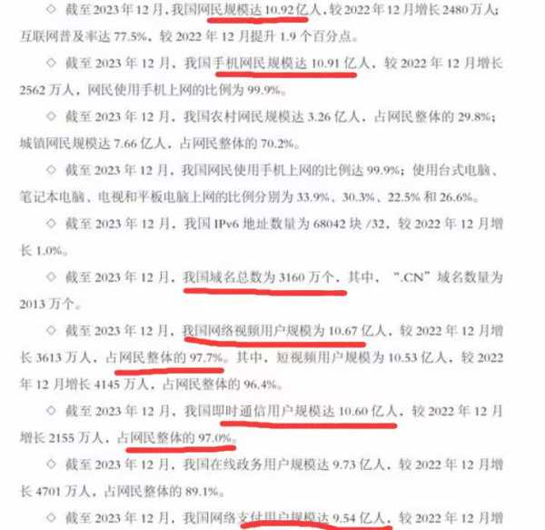 中国互联网络信息中心第53统计数据显示,截止2023年12月,网民数10.92亿,手机网民10.91亿,视频用户10.67亿(短视频10.53亿),即时通信用户10.60亿,网络支付用户9.54亿,网络购物用户9.15亿,搜索引擎用户8.27亿。