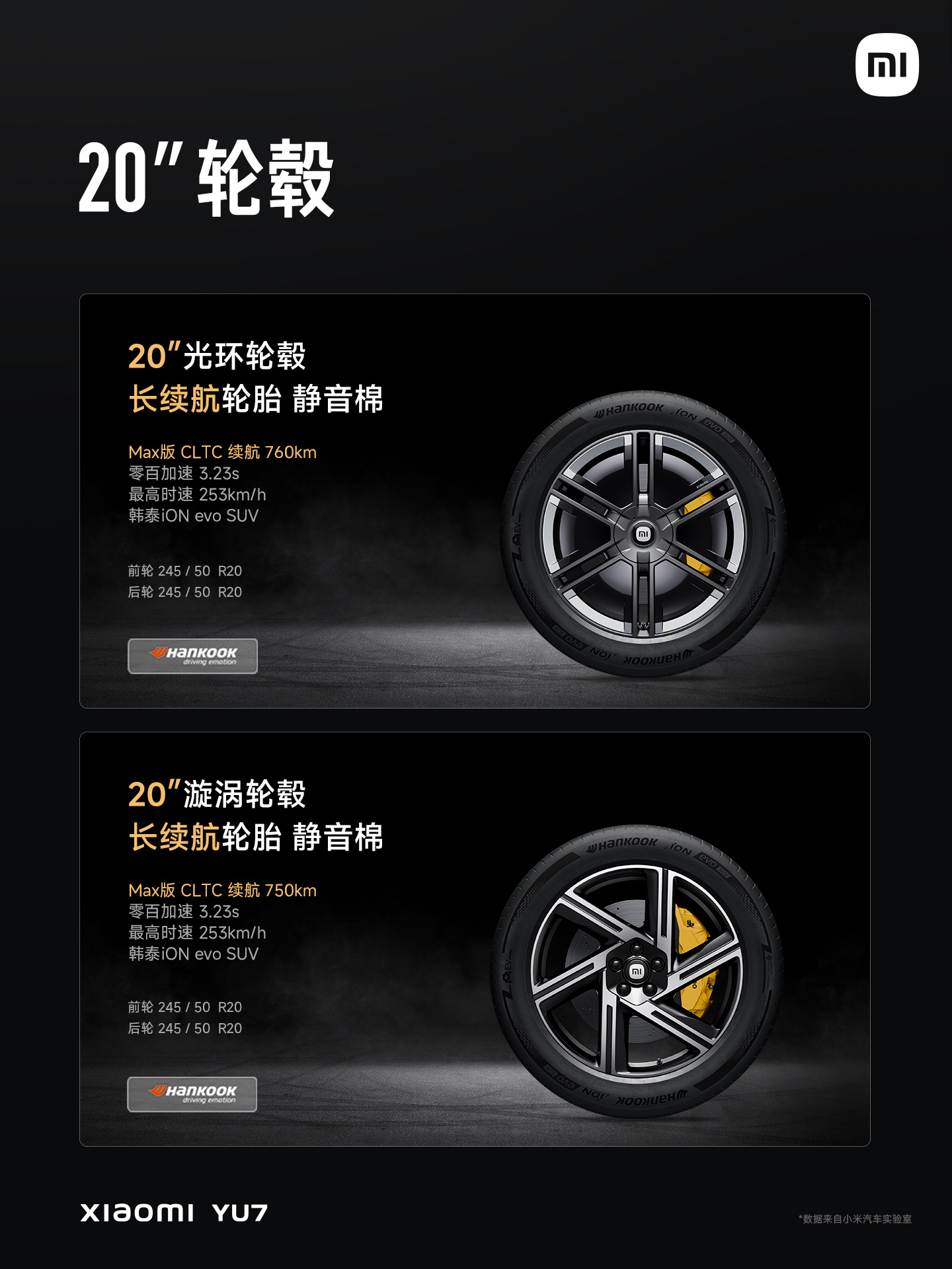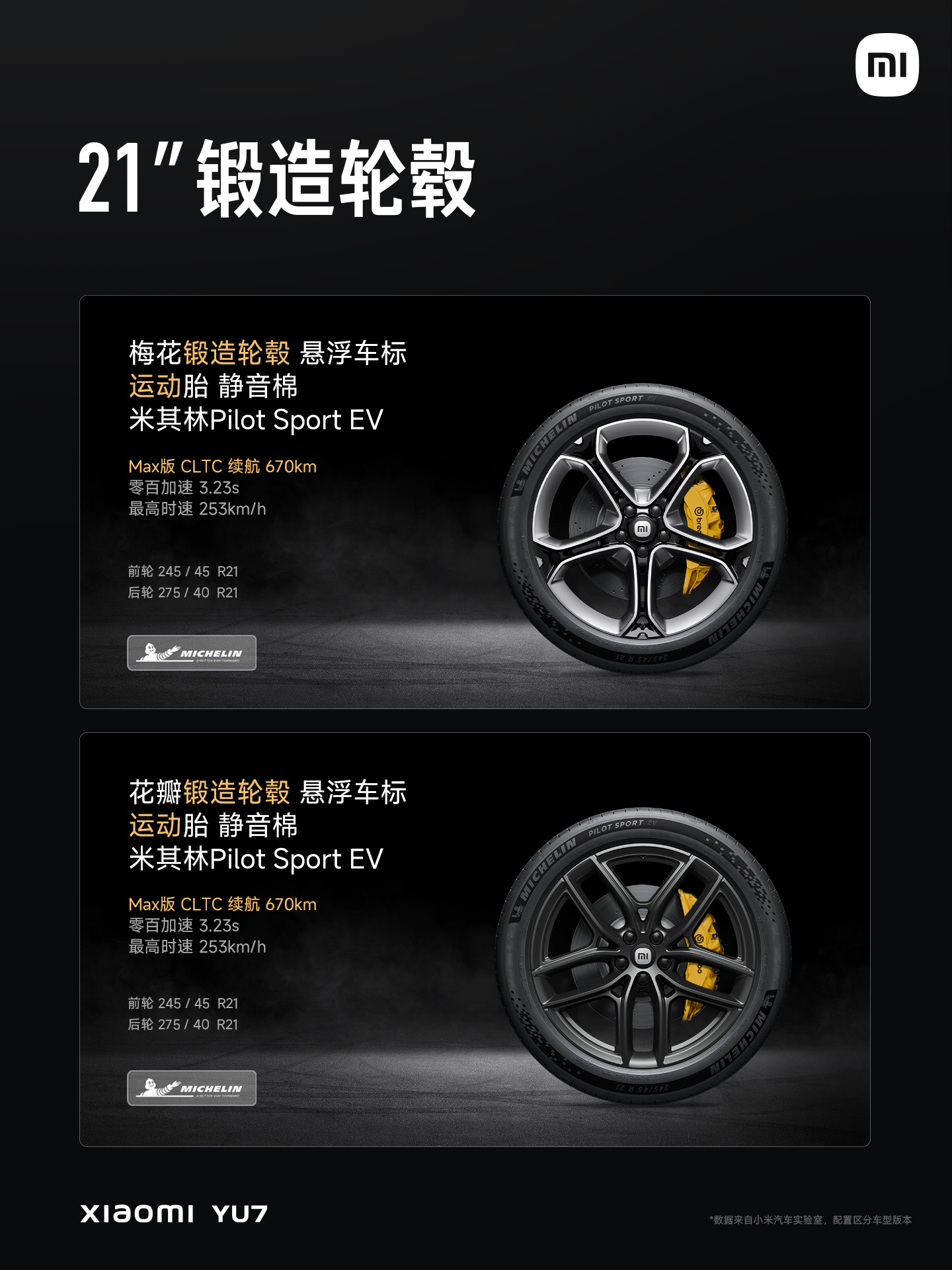 • YU7 Max:双电机四驱,零百 3.23 秒(不含起步时间为 2.98 秒),峰值功率 508kW,峰值扭矩 866N・m,最高车速 253km/h。