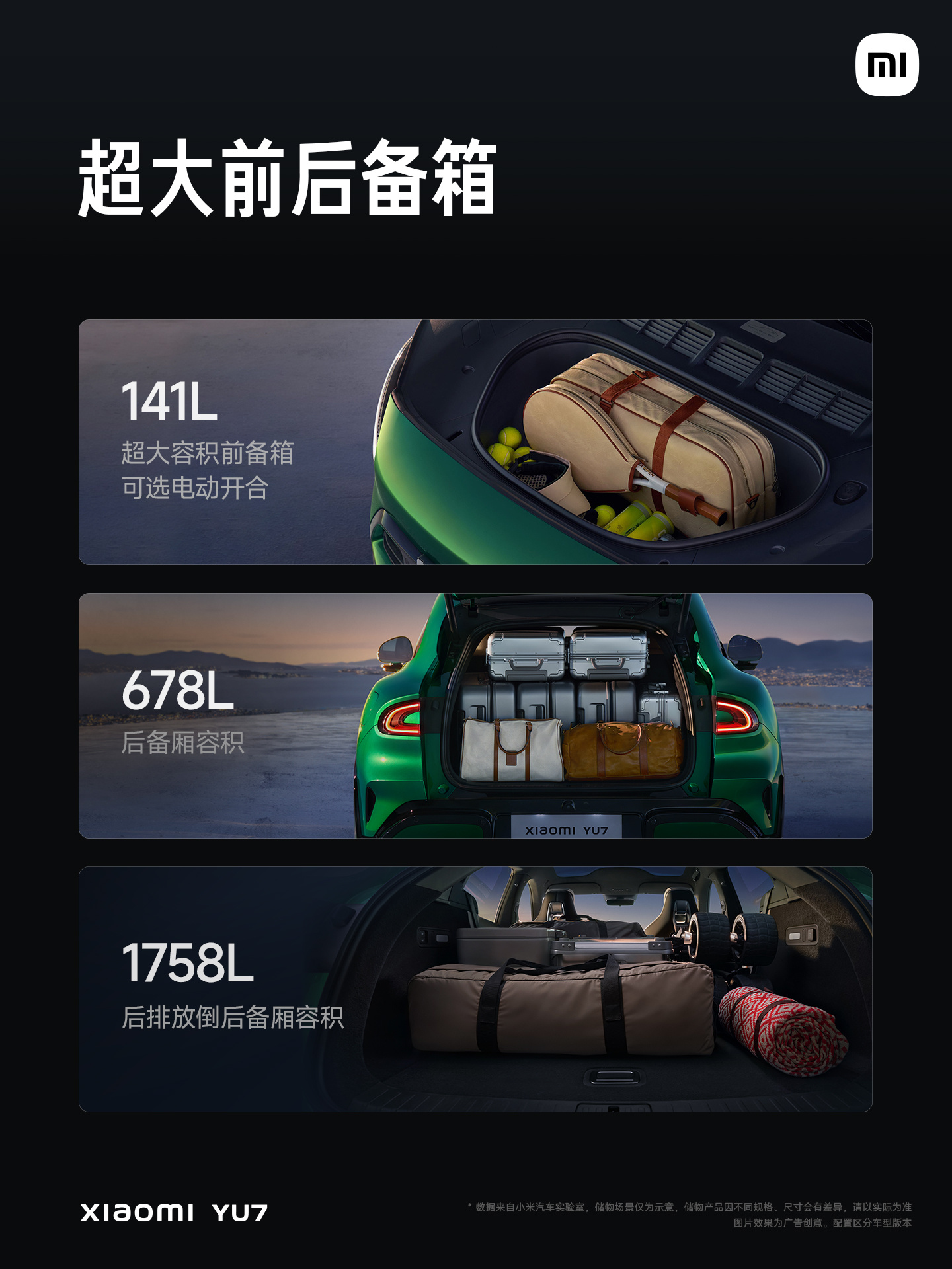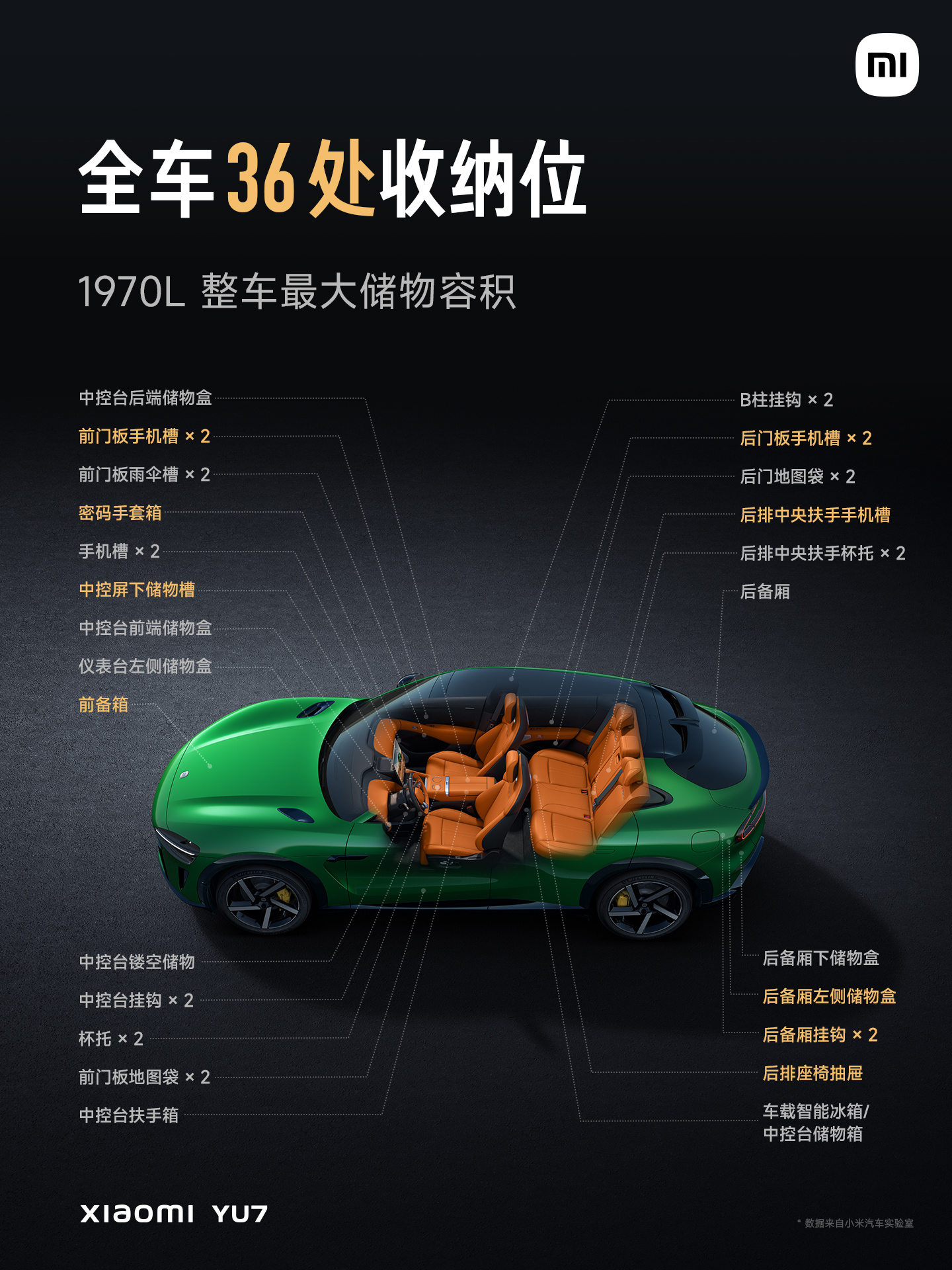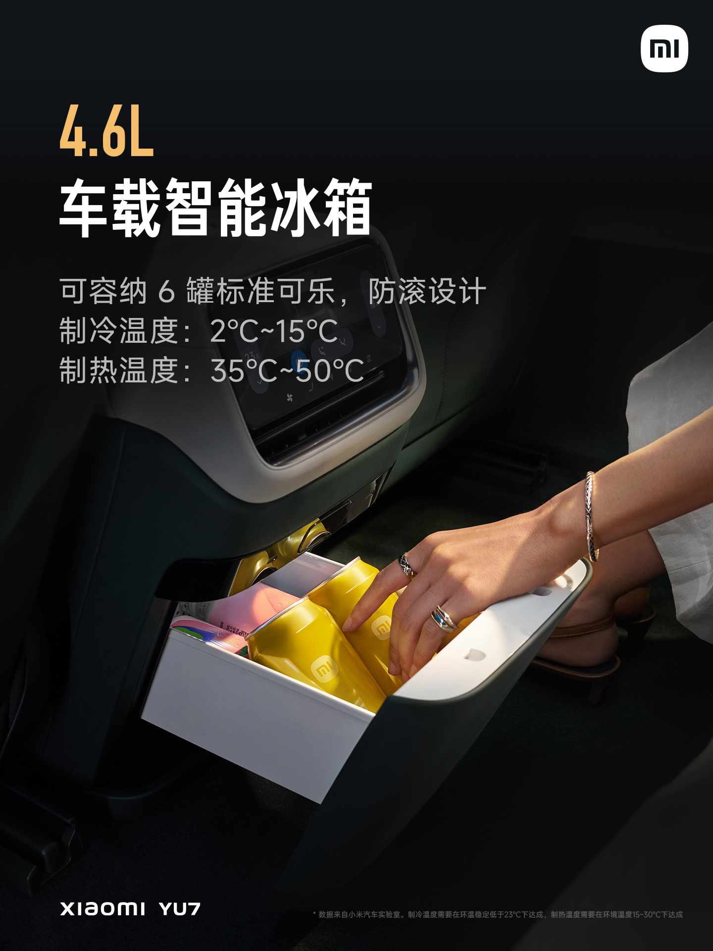 小米 YU7 全车拥有 36 处储物收纳空间,最大储物容积 1970L,内置 4.6L 车载智能冰箱,可容纳 6 罐标准可乐;内置 25 扬声器的豪华音响系统,支持主动降噪及杜比全景声。