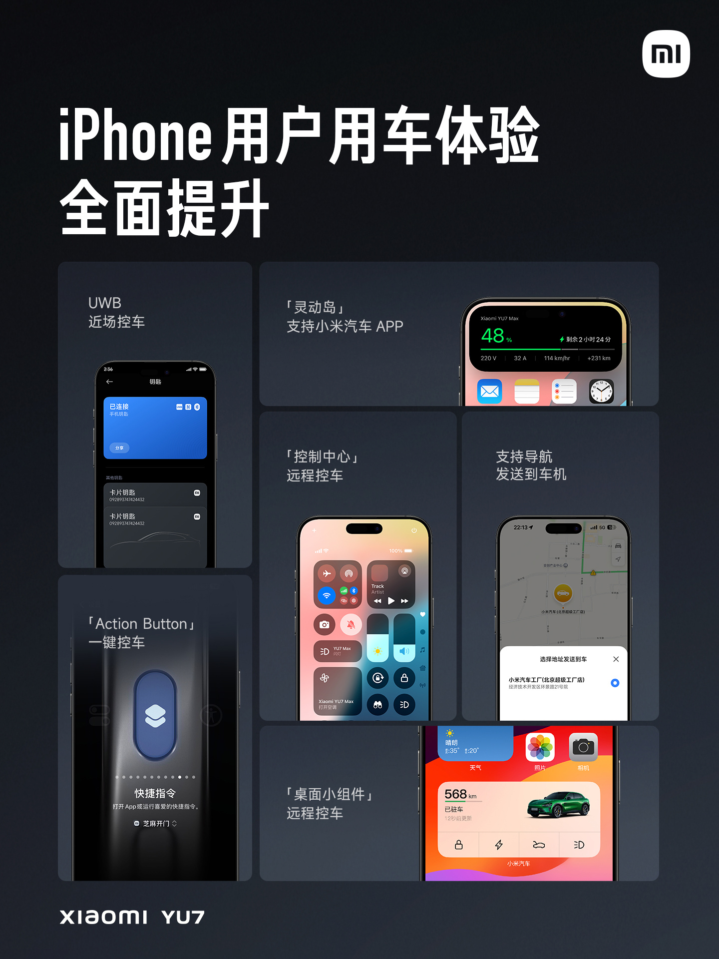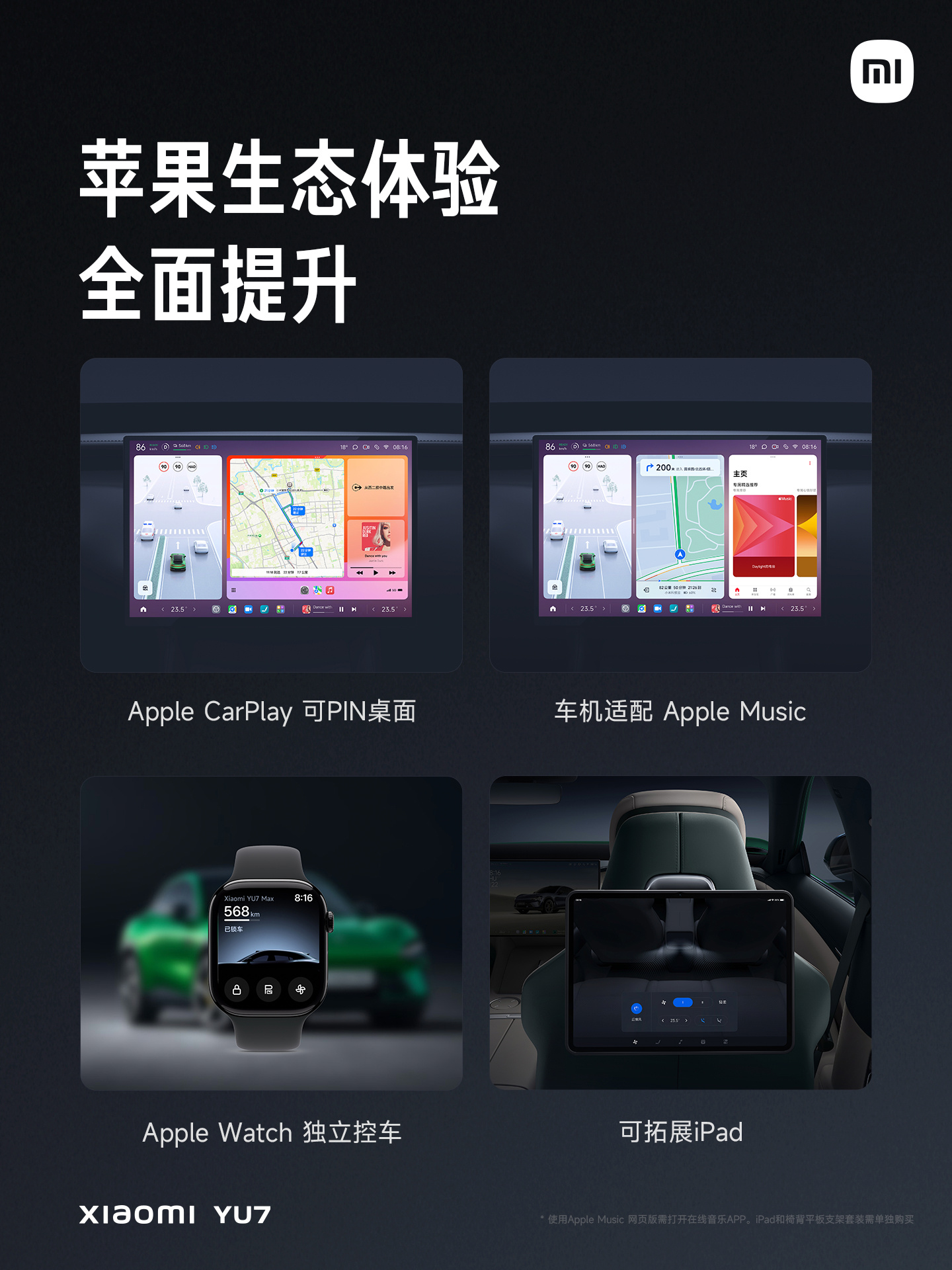 小米 YU7 还实现 iPhone 用户用车体验的全面提升:支持 UWB 近场控车、桌面小组件、控制中心远程控车, Action Button 一键控车,灵动岛支持小米汽车 App。苹果生态体验也全面提升: CarPlay 可 PIN 桌面,车机适配 Apple Music,Apple Watch 独立控车,后排还可拓展 iPad。