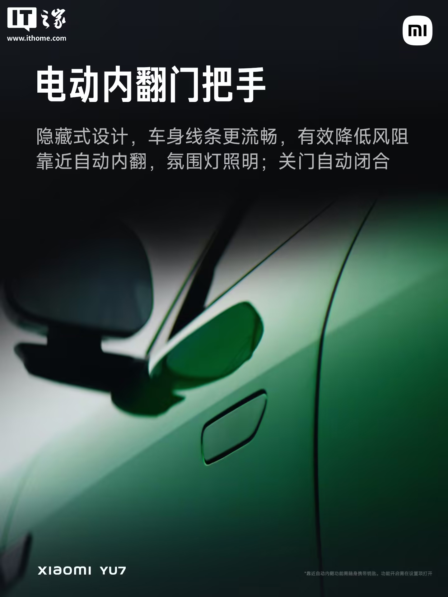 搭配支持 UWB 的手机,小米 YU7 汽车可实现无感开锁车门,无需操控车钥匙,还支持站立三秒前备箱自动开启。